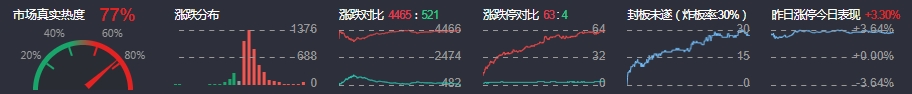 3、两市共4465只个股上涨,63只个股涨停,521只个股下跌,4只个股跌停,23只股票炸板,炸板率30%。