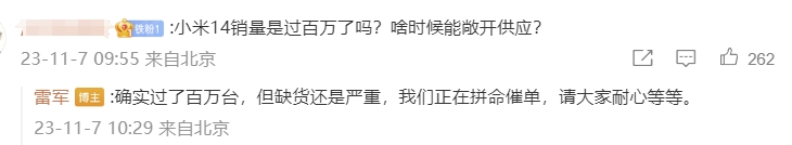小米董事长雷军在微博与网友互动时称,小米14销量已过百万台,但缺货还是严重,正在催单。 风险提示及免责条款 市场有风险,投资需谨慎。本文不构成个人投资建议,也未考虑到个别用户特殊的投资目标、财务状况或需要。用户应考虑本文中的任何意见、观点或结论是否符合其特定状况。据此投资,责任自负。