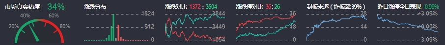3、两市共1372只个股上涨,35只个股涨停,3504只个股下跌,26只个股跌停,24只股票炸板,炸板率39%。