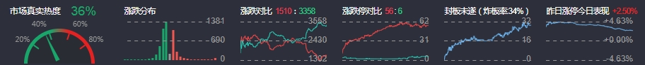 3、两市共1510只个股上涨,56只个股涨停,3358只个股下跌,6只个股跌停,28只股票炸板,炸板率34%。