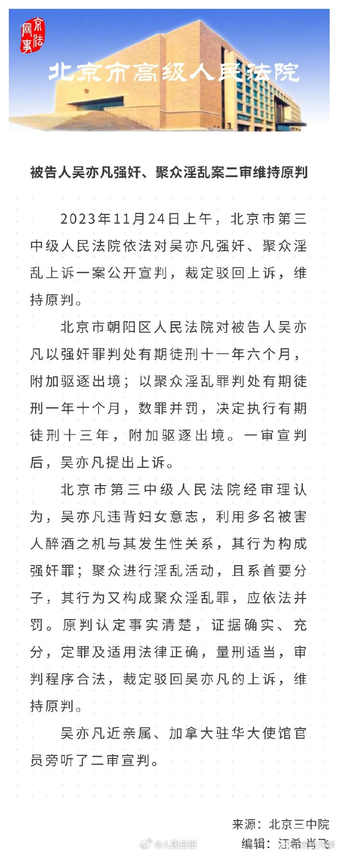 被告人吴亦凡强奸、聚众淫乱案二审维持原判 2023年11月24日上午,北京市第三中级人民法院依法对吴亦凡强奸、聚众淫乱上诉一案公开宣判,裁定驳回上诉,维持原判。 风险提示及免责条款 市场有风险,投资需谨慎。本文不构成个人投资建议,也未考虑到个别用户特殊的投资目标、财务状况或需要。用户应考虑本文中的任何意见、观点或结论是否符合其特定状况。据此投资,责任自负。