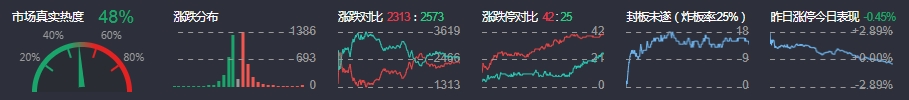 3、两市共2313只个股上涨,42只个股涨停,2573只个股下跌,25只个股跌停,12只股票炸板,炸板率25%。