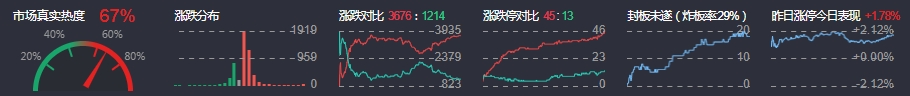 3、两市共3676只个股上涨,45只个股涨停,1214只个股下跌,13只个股跌停,15只股票炸板,炸板率29%。