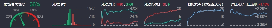 3、两市共1490只个股上涨,30只个股涨停,3406只个股下跌,9只个股跌停,13只股票炸板,炸板率36%。