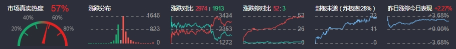3、两市共2974只个股上涨,52只个股涨停,1913只个股下跌,3只个股跌停,17只股票炸板,炸板率28%。