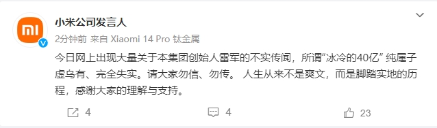 小米公司发言人:今日网上出现大量关于本集团创始人雷军的不实传闻,所谓“冰冷的40亿” 纯属子虚乌有、完全失实。 风险提示及免责条款 市场有风险,投资需谨慎。本文不构成个人投资建议,也未考虑到个别用户特殊的投资目标、财务状况或需要。用户应考虑本文中的任何意见、观点或结论是否符合其特定状况。据此投资,责任自负。