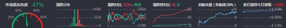 3、两市共2226只个股上涨,56只个股涨停,2629只个股下跌,8只个股跌停,13只股票炸板,炸板率20%。
