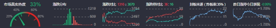 3、两市共1316只个股上涨,36只个股涨停,3670只个股下跌,16只个股跌停,17只股票炸板,炸板率35%。