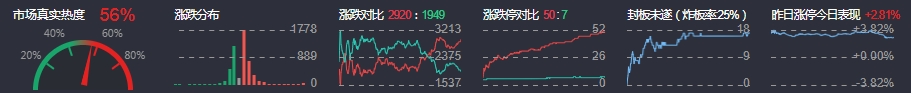 3、两市共2920只个股上涨,50只个股涨停,1949只个股下跌,7只个股跌停,14只股票炸板,炸板率25%。