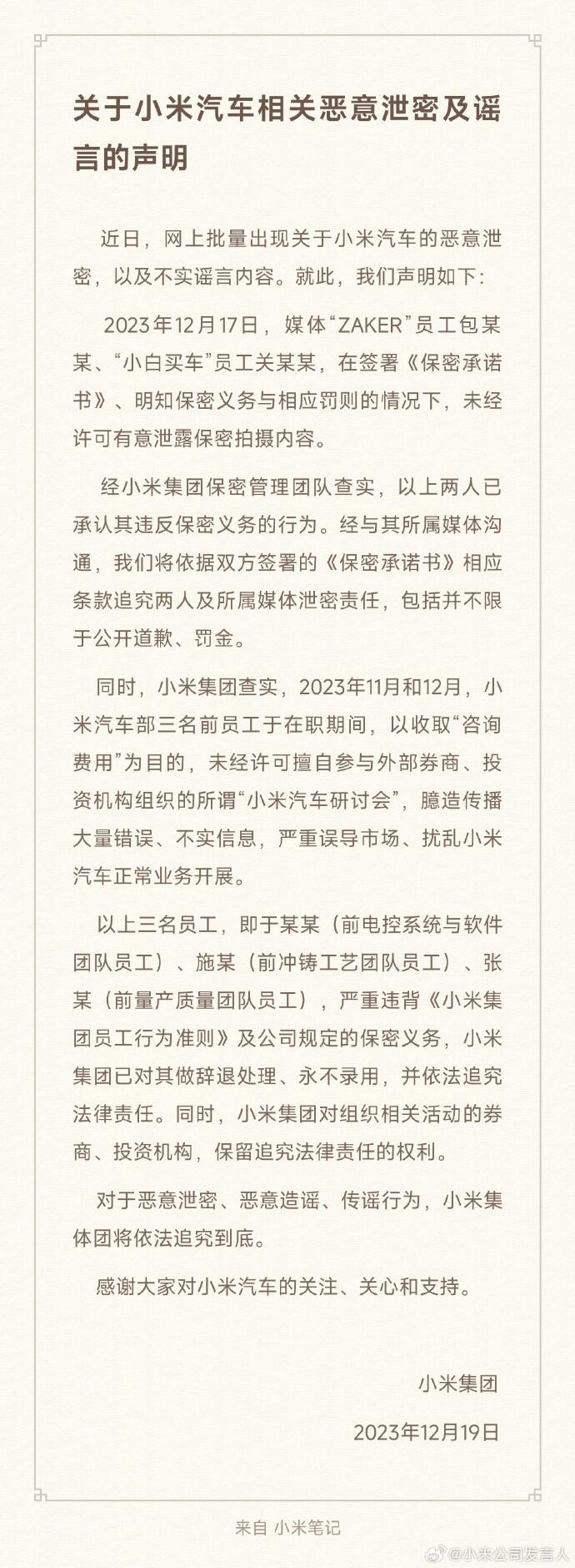 小米集团发布关于小米汽车相关恶意泄密及谣言的声明。2023年12月17日,媒体“ZAKER”员工包某某、“小白买车”员工关某某,在签署《保密承诺书》、明知保密义务与相应罚则的情况下,未经许可有意泄露保密拍摄内容。经小米集团保密管理团队查实,以上两人已承认其违反保密义务的行为。经与其所属媒体沟通,我们将依据双方签署的《保密承诺书》相应条款追究两人及所属媒体泄密责任,包括并不限于公开道歉、罚金。