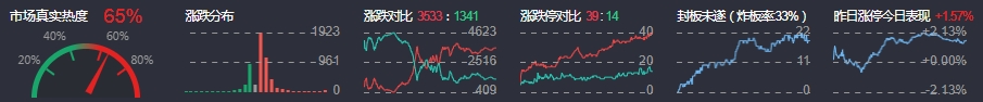 3、两市共3533只个股上涨,39只个股涨停,1341只个股下跌,14只个股跌停,14只股票炸板,炸板率33%。