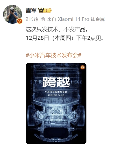 小米董事长雷军在微博表示,12月28日小米汽车技术发布会“只发技术,不发产品”。 风险提示及免责条款 市场有风险,投资需谨慎。本文不构成个人投资建议,也未考虑到个别用户特殊的投资目标、财务状况或需要。用户应考虑本文中的任何意见、观点或结论是否符合其特定状况。据此投资,责任自负。