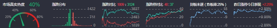 3、两市共1809只个股上涨,40只个股涨停,3124只个股下跌,37只个股跌停,12只股票炸板,炸板率25%。