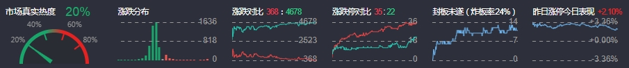 3、两市共368只个股上涨,35只个股涨停,4678只个股下跌,22只个股跌停,11只股票炸板,炸板率24%。