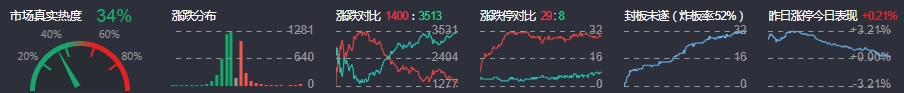 3、两市共1400只个股上涨,29只个股涨停,3513只个股下跌,8只个股跌停,31只股票炸板,炸板率52%。