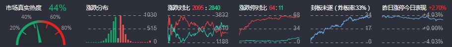 3、两市共2095只个股上涨,64只个股涨停,2840只个股下跌,11只个股跌停,26只股票炸板,炸板率33%。