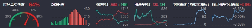 3、两市共3586只个股上涨,138只个股涨停,1464只个股下跌,135只个股跌停,88只股票炸板,炸板率39%。