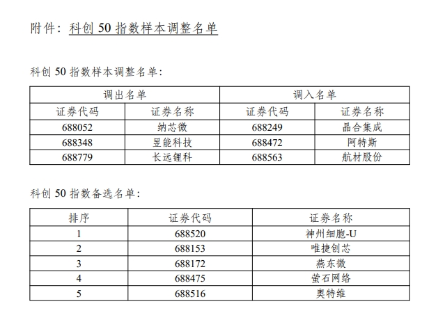 上海证券交易所与中证指数有限公司决定调整科创50指数样本,于2024年3月8日收市后生效,本次科创50指数更换3只样本。 风险提示及免责条款 市场有风险,投资需谨慎。本文不构成个人投资建议,也未考虑到个别用户特殊的投资目标、财务状况或需要。用户应考虑本文中的任何意见、观点或结论是否符合其特定状况。据此投资,责任自负。