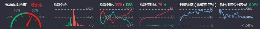 3、两市共3525只个股上涨,75只个股涨停,1368只个股下跌,4只个股跌停,27只股票炸板,炸板率27%。