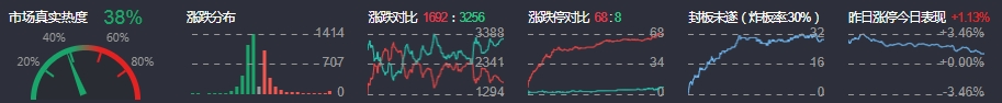 3、两市共1692只个股上涨,68只个股涨停,3256只个股下跌,8只个股跌停,26只股票炸板,炸板率30%。