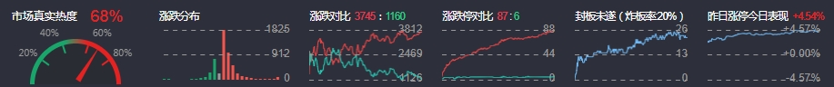 3、两市共3745只个股上涨,87只个股涨停,1160只个股下跌,6只个股跌停,20只股票炸板,炸板率20%。