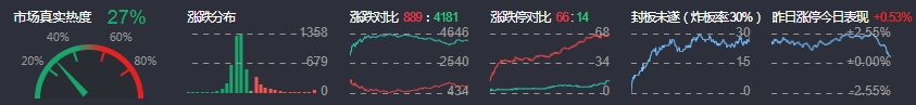3、两市共889只个股上涨,66只个股涨停,4181只个股下跌,14只个股跌停,26只股票炸板,炸板率30%。
