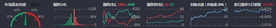 3、两市共2468只个股上涨,63只个股涨停,2449只个股下跌,21只个股跌停,24只股票炸板,炸板率29%。