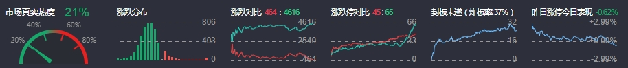 3、两市共464只个股上涨,45只个股涨停,4616只个股下跌,65只个股跌停,24只股票炸板,炸板率37%。