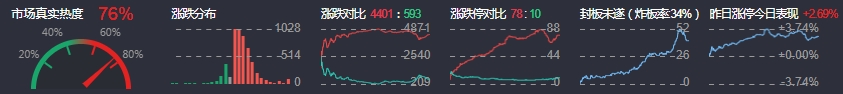3、两市共4401只个股上涨,78只个股涨停,593只个股下跌,10只个股跌停,38只股票炸板,炸板率34%。