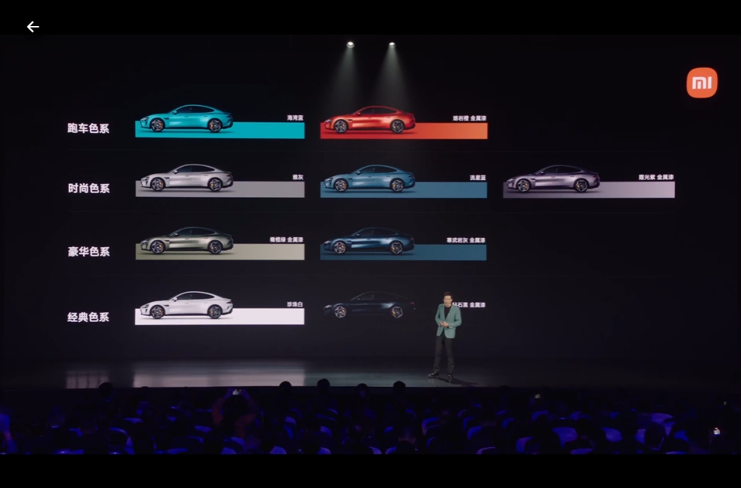 小米集团董事长雷军在发布会上表示,小米SU7首发将有9款颜色。 风险提示及免责条款 市场有风险,投资需谨慎。本文不构成个人投资建议,也未考虑到个别用户特殊的投资目标、财务状况或需要。用户应考虑本文中的任何意见、观点或结论是否符合其特定状况。据此投资,责任自负。