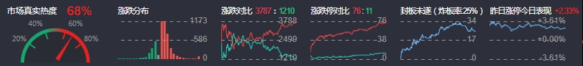3、两市共3787只个股上涨,76只个股涨停,1210只个股下跌,11只个股跌停,26只股票炸板,炸板率25%。