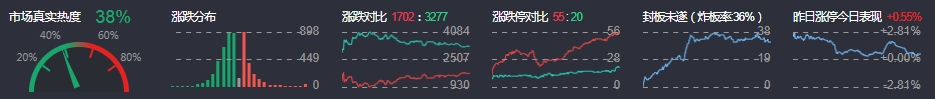 3、两市共1702只个股上涨,55只个股涨停,3277只个股下跌,20只个股跌停,27只股票炸板,炸板率36%。