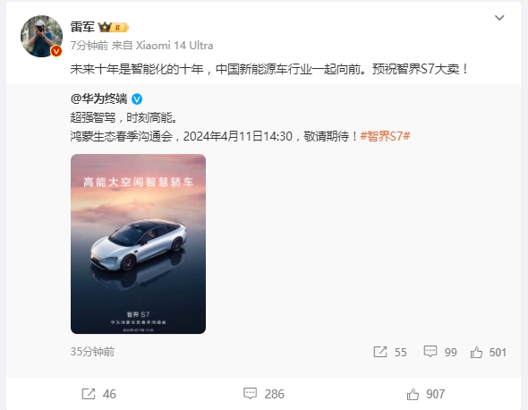 雷军:预祝智界S7大卖。 风险提示及免责条款 市场有风险,投资需谨慎。本文不构成个人投资建议,也未考虑到个别用户特殊的投资目标、财务状况或需要。用户应考虑本文中的任何意见、观点或结论是否符合其特定状况。据此投资,责任自负。