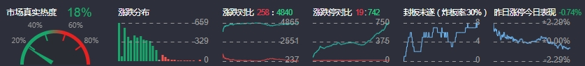 3、两市共258只个股上涨,19只个股涨停,4840只个股下跌,742只个股跌停,7只股票炸板,炸板率30%。