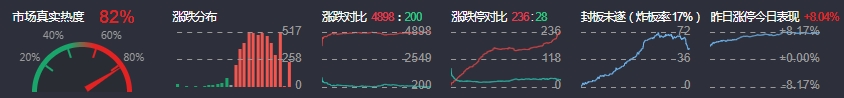 3、两市共4898只个股上涨,236只个股涨停,200只个股下跌,28只个股跌停,46只股票炸板,炸板率17%。