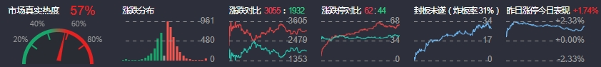 3、两市共3055只个股上涨,62只个股涨停,1932只个股下跌,44只个股跌停,22只股票炸板,炸板率31%。