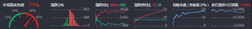 3、两市共4036只个股上涨,72只个股涨停,950只个股下跌,26只个股跌停,22只股票炸板,炸板率27%。