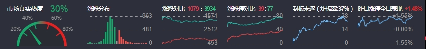 3、两市共1079只个股上涨,39只个股涨停,3934只个股下跌,77只个股跌停,23只股票炸板,炸板率37%。