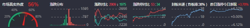 3、两市共2909只个股上涨,53只个股涨停,1975只个股下跌,34只个股跌停,30只股票炸板,炸板率38%。