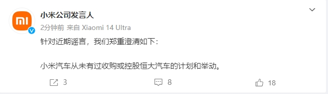 小米公司发言人:小米汽车从未有过收购或控股恒大汽车的计划和举动。 风险提示及免责条款 市场有风险,投资需谨慎。本文不构成个人投资建议,也未考虑到个别用户特殊的投资目标、财务状况或需要。用户应考虑本文中的任何意见、观点或结论是否符合其特定状况。据此投资,责任自负。
