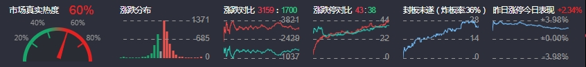 3、两市共3159只个股上涨,43只个股涨停,1700只个股下跌,38只个股跌停,18只股票炸板,炸板率36%。