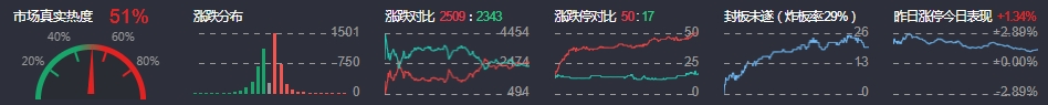 3、两市共2509只个股上涨,50只个股涨停,2343只个股下跌,17只个股跌停,18只股票炸板,炸板率17%。