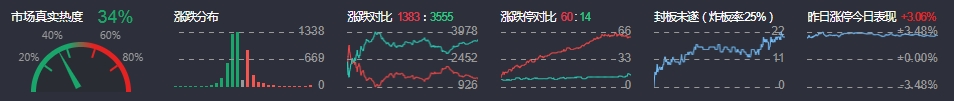 3、两市共1383只个股上涨,60只个股涨停,3555只个股下跌,14只个股跌停,12只股票炸板,炸板率25%。