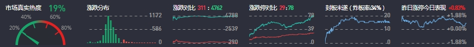 3、两市共311只个股上涨,29只个股涨停,4762只个股下跌,78只个股跌停,12只股票炸板,炸板率34%。