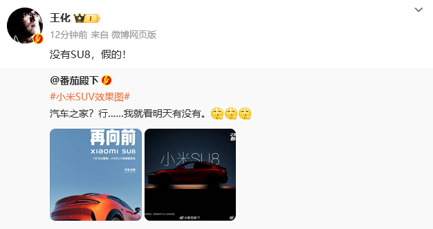 小米王化辟谣:没有SU8,假的 有市场传闻称,7月16日小米将揭晓SU8,并传出小米SUV效果图。对此,小米公关部总经理王化通过微博辟谣称:“没有SU8,假的! ” 风险提示及免责条款 市场有风险,投资需谨慎。本文不构成个人投资建议,也未考虑到个别用户特殊的投资目标、财务状况或需要。用户应考虑本文中的任何意见、观点或结论是否符合其特定状况。据此投资,责任自负。
