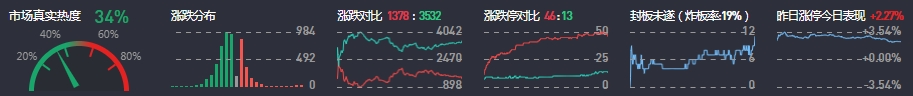 3、两市共1378只个股上涨,46只个股涨停,3532只个股下跌,13只个股跌停,7只股票炸板,炸板率19%。