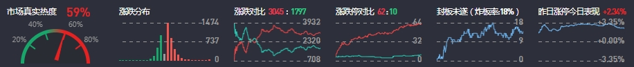 3、两市共3045只个股上涨,62只个股涨停,1797只个股下跌,10只个股跌停,12只股票炸板,炸板率18%。