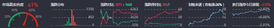 3、两市共3211只个股上涨,59只个股涨停,1648只个股下跌,7只个股跌停,16只股票炸板,炸板率24%。