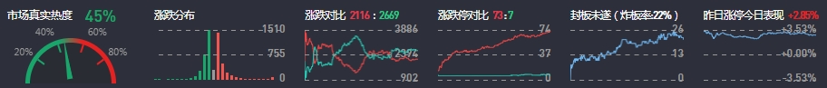 3、两市共2116只个股上涨,73只个股涨停,2669只个股下跌,7只个股跌停,18只股票炸板,炸板率22%。