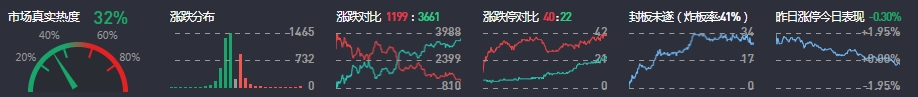 3、两市共1199只个股上涨,40只个股涨停,3661只个股下跌,22只个股跌停,19只股票炸板,炸板率41%。